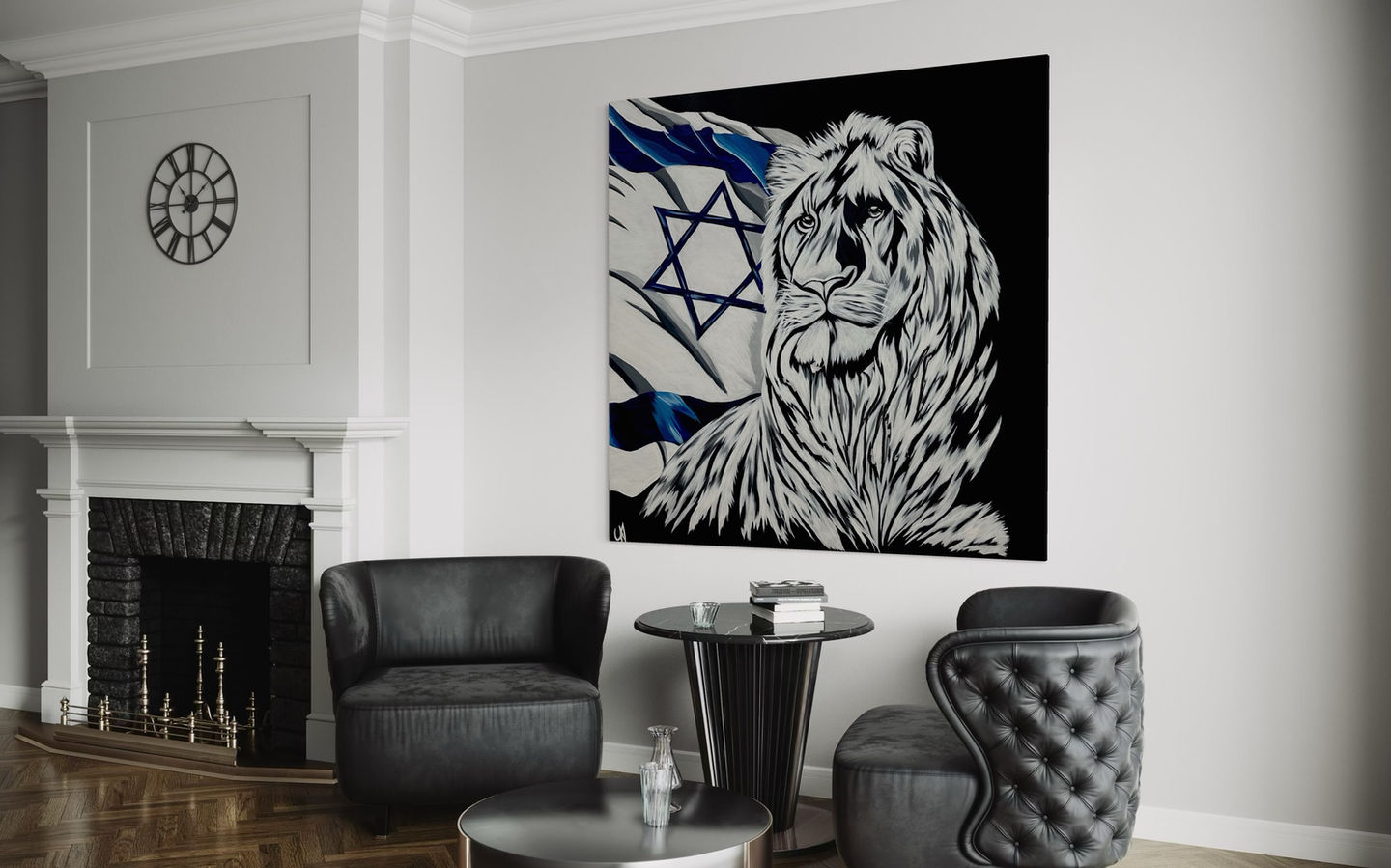 אריה לבן וסמכותי ניצב על יד דגל ישראל, יצירה זו מעבירה מסר עמוק על עוצמת עם ישראל.