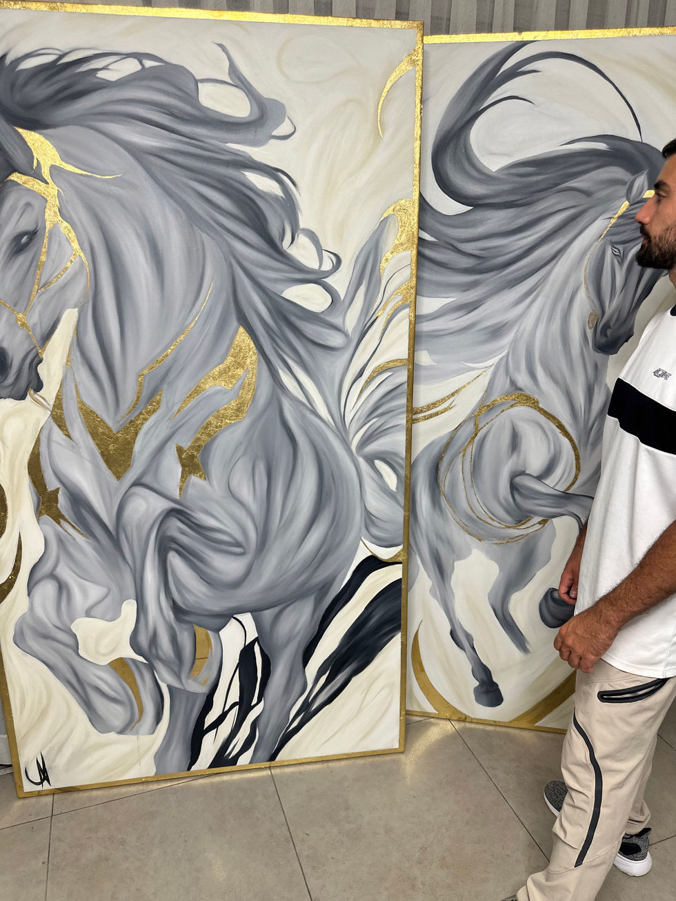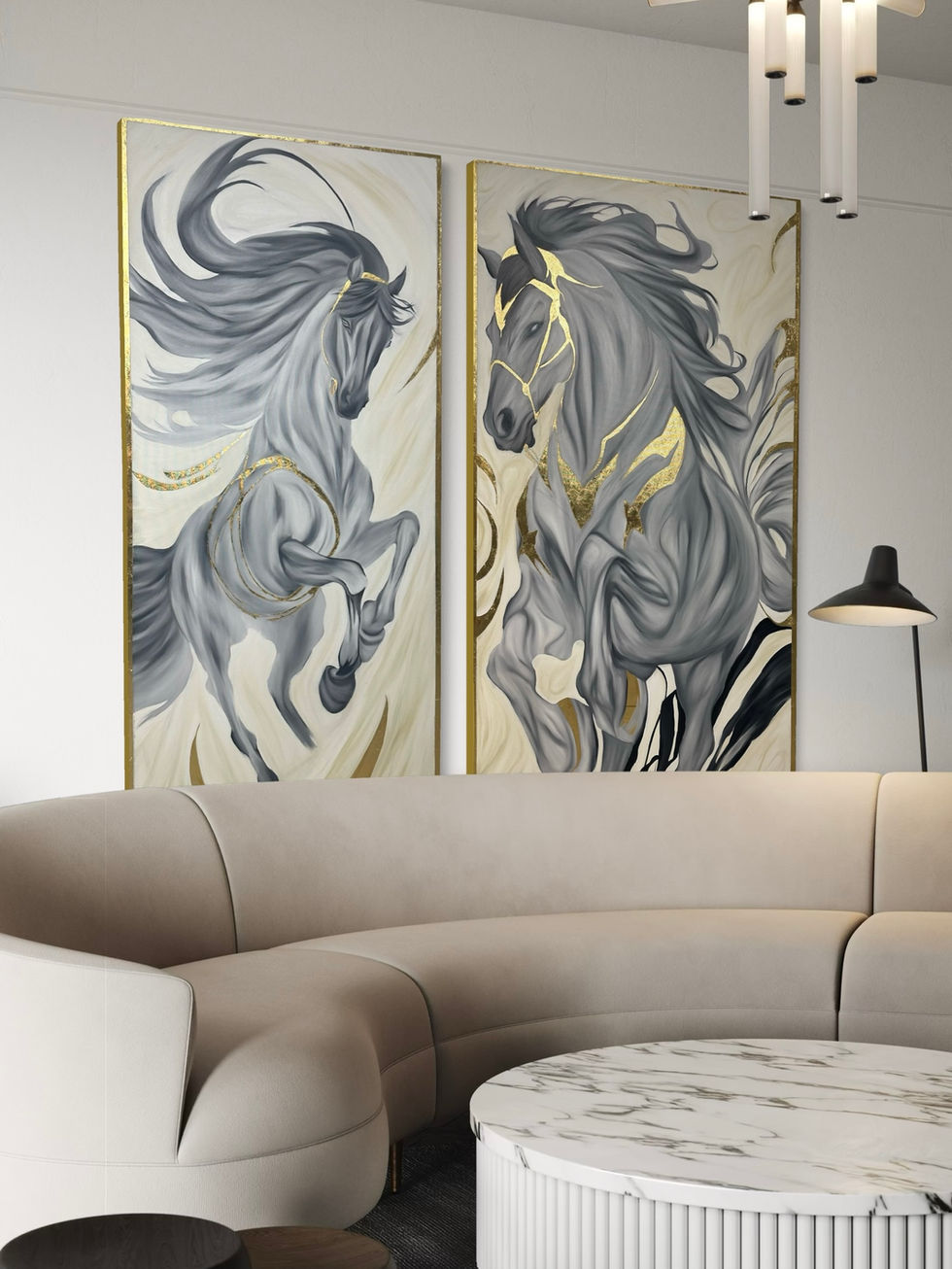 הסוסים המרהיבים, בגוני אפור עם נגיעות זהב מלכותיות, לוכדים את תנועתם הדינמית במלוא עוצמתה - הרעמות המתנופפות ברוח והתנועה הסוערת משדרות חופש, כוח ומהירות בלתי מרוסנת -- יצירות שמכניסות אלגנטיות שקטה אבל גם יוקרה ועומק לחלל.